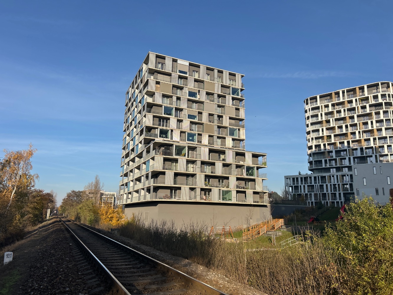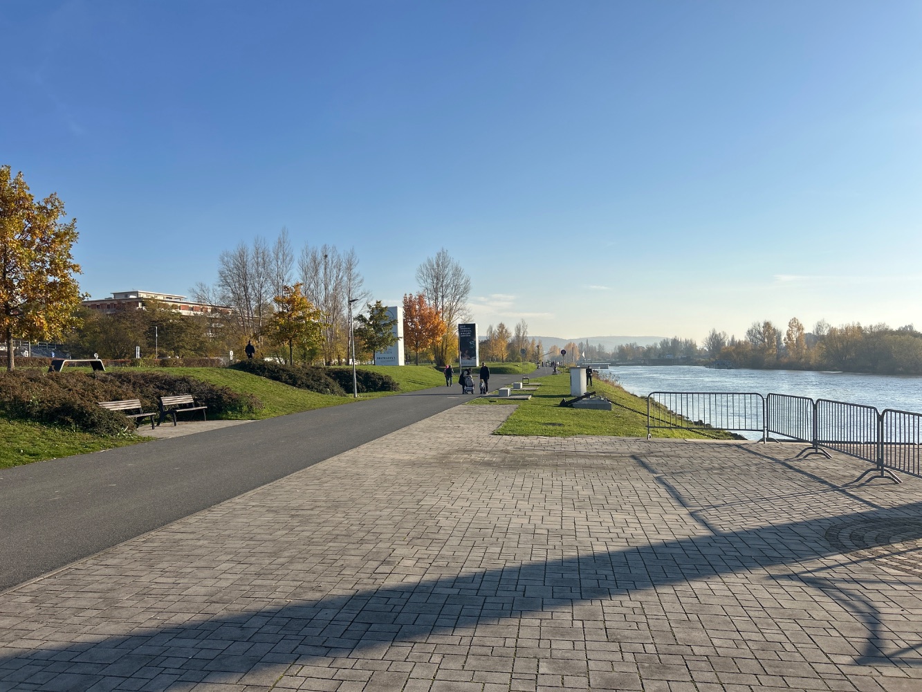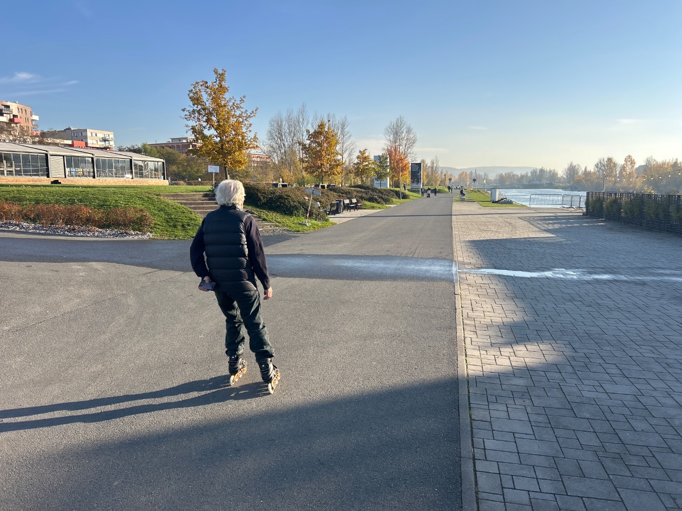 Řeka ochlazuje nábřeží a přináší proudění i v teplých dnech, zatímco aleje a parky mezi domy zvyšují komfort pobytu. Přírodní břehy drží biodiverzitu a nabízejí klidná místa pro odpočinek. Díky délce nábřeží si vybereš rušnější promenádu i tiché zákoutí. Zeleň prostupuje novými čtvrtěmi a zlepšuje kvalitu ovzduší.