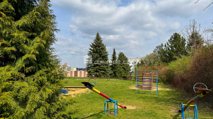 K bytu patří podíl na nezastavěném pozemku o rozloze 17 000 m2, na kterém je parková úprava s dětský pískovištěm.