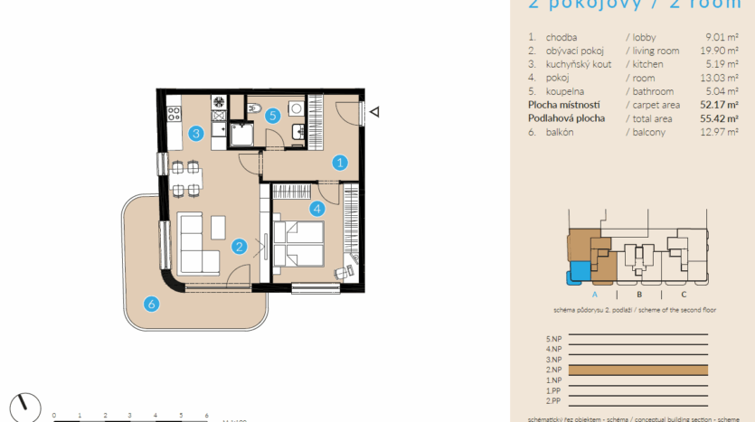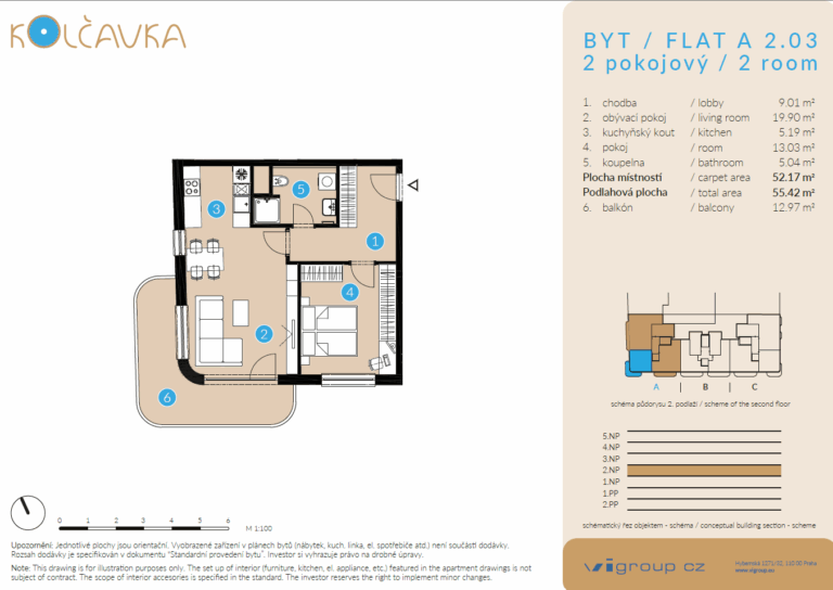 Zajímavě dispozičně řešený rohový byt 2+kk s balkonem se nachází ve 2NP domu a má jižní a západní orientaci. Obývací pokoj s kuchyňským koutem tvoří jeden celek a je z něj i přístup na prostorný balkon. Druhý pokoj nebo ložnice je pak orientována na západ. Součástí bytu je dále větší vstupní chodba s praktickým místem na případnou vestavěnou skříň a vstup do koupelny s WC a sprchový kout.
