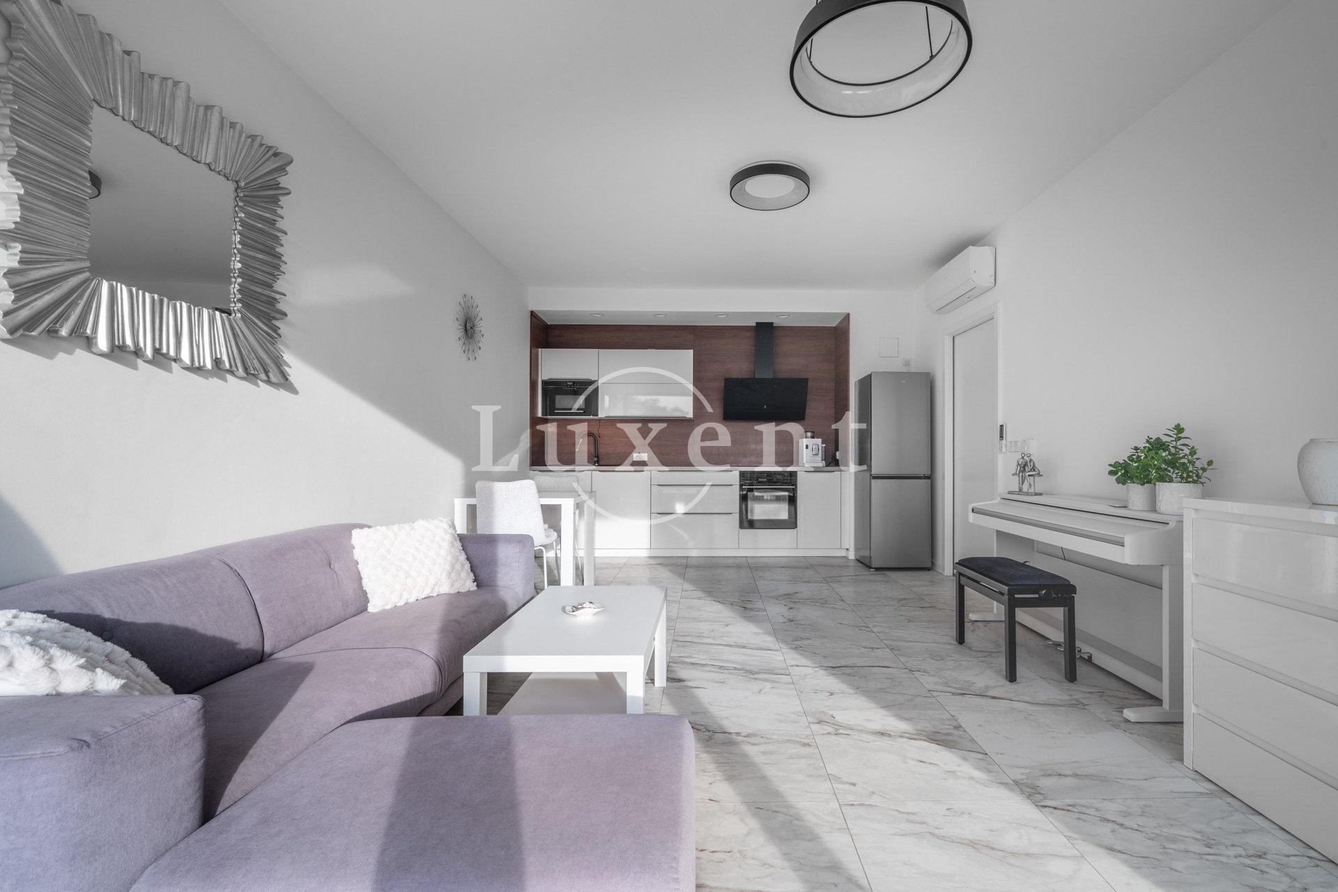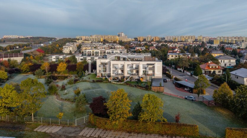 Nabízíme exkluzivně k prodeji moderní byt 2+kk o užitné ploše 56 m2, s krásnou terasou a předzahrádkou, o velikosti 46,1 m2, sklepem a zastřešeným parkovacím stáním. Jedná se o komorní projekt Rezidence Stříbrná zahrada v žádané lokalitě Újezd u Průhonic.Byt je situován v 1.NP, interiér zahrnuje předsíň, velkorysý vzdušný obývací pokoj s kuchyní, ložnici, prostornou koupelnu s vanou, toaletou a komoru, kde je prostor pro pračku. Oba pokoje májí přímý vstup na předzahrádku, pro příjemné posezení, ale také propojení s přírodou a výhledy do atmosferické zahrady se vzrostlou zelení a jezírkem.Byt má jednotný minimalistický a nadčasový design. V nemovitosti jsou použity kvalitní materiály, podlahové vytápění, rekuperace, velkoformátová dřevěná okna s trojskly a předokenními žaluziemi. V obývacím pokoji je umístěna klimatizační jednotka. Podlahová krytina byla zvolena v kombinaci dlažby a plovoucí dřevěné podlahy, která je v ložnici. Energetická třída je velmi úsporná B. Újezd u Průhonic je žádanou rezidenční lokalitou, která nabízí komfortní bydlení v blízkosti přírody a skvělou dopravní dostupnost do centra Prahy. Pro volnočasové aktivity je ideální nedaleký Milíčovský les s rybníky nebo Průhonický park. V okolí je kompletní občanská vybavenost, školy, školky, nákupní centra, restaurace, kavárny. Před domem je autobusová zastávka směr Opatov nebo Průhonice – Čestlice. Autem 5 minut od OC Chodov nebo nákupní zóny Čestlice.
