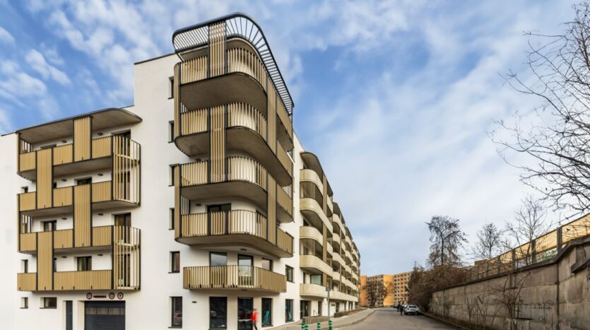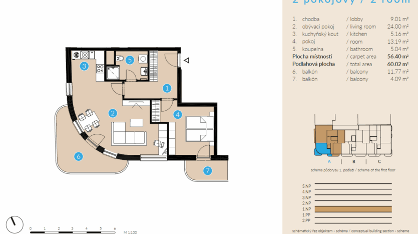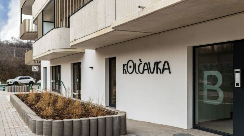 Zajímavě dispozičně řešený rohový byt 2+kk s dvěmi balkony se nachází v 1NP domu a má jihozápadní orientaci. Obývací pokoj a velkou ložnici propojuje do jednoho funkčního celku velký bakon. Ložnice je orientována na jih a obývací pokoj má orientaci jih a západ. Součástí bytu je dále větší vstupní chodba odkud je přístupná i spojená koupelna s WC. V předsíni je místo i pro případný vestavěný nábytek.