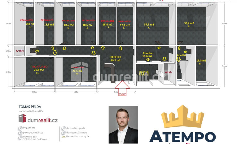 Dumrealit.cz Vám zprostředkuje pronájem nově zrekonstruovaných kancelářských prostor s parkovacím stáním v areálu bývalé Jitony ve městě Vimperk, ul. 1 máje. Možnost pronájmu kancelářských prostor v 1. patře v budově s výtahem. Kanceláře od 18 m2. Cena pronájmu je 1310,- Kč/m2/rok + služby 1450,- Kč/m2/rok. Ceny jsou uvedené bez DPH. Sociální zázemí je společné na chodbě na patře. V budově je funkční zabezpečovací systém. Možnost parkování na parkovišti před administrativní budovou. Více informací Vám poskytne realitní makléř Tomáš Pelda z realitní kanceláře A TEMPO fungující pod ochrannou známkou dumrealit.cz.. Ev. číslo: 644580. Bližší informace Vám sdělí Tomáš Pelda, 739 341 014, pelda@dumrealit.cz