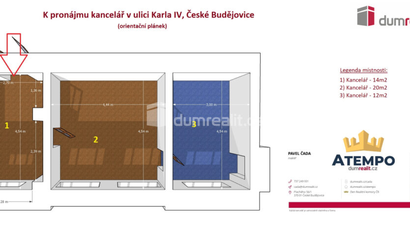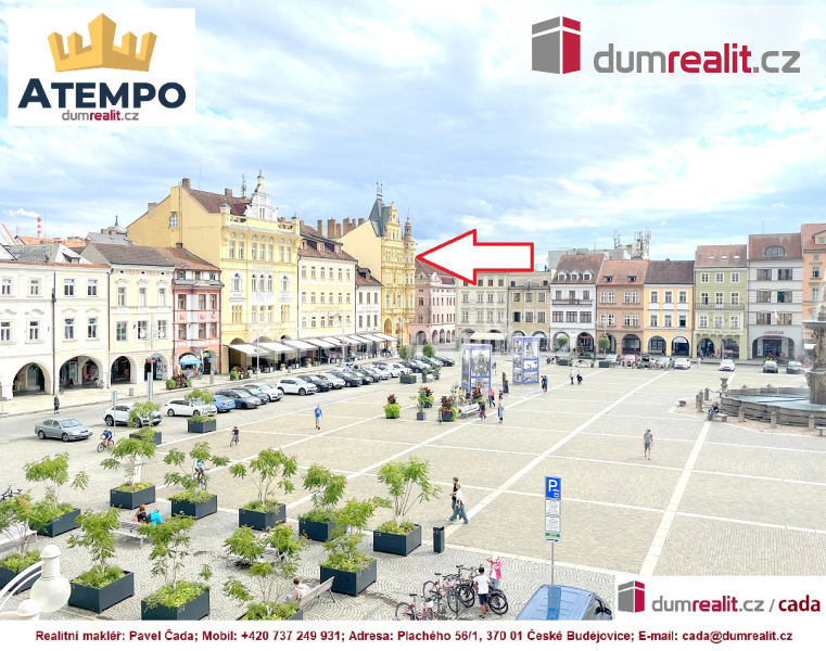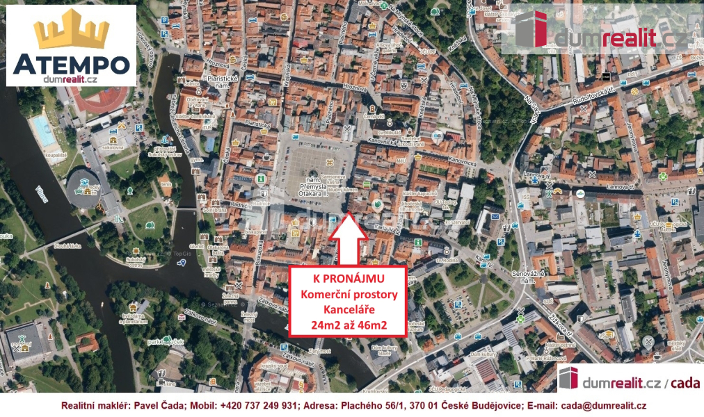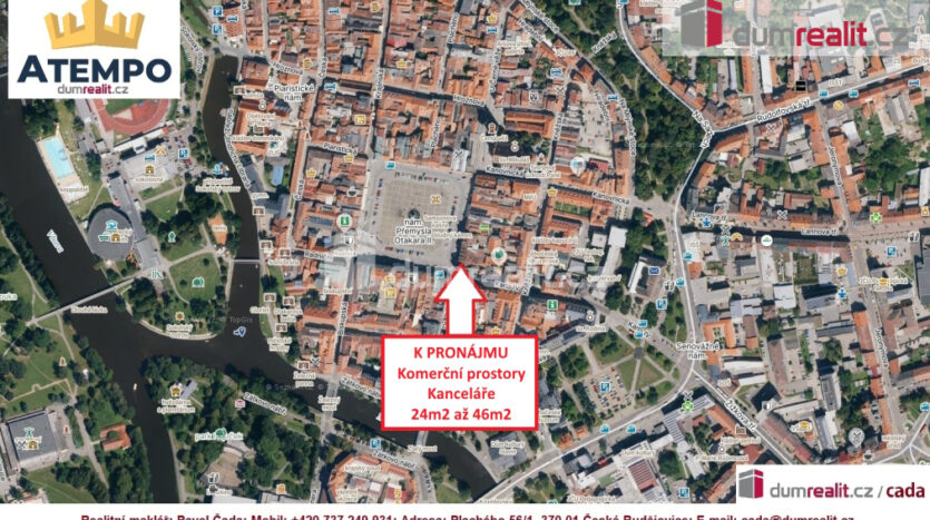 Dumrealit.cz Vám zprostředkuje pronájem komerčních a kancelářských prostor s kuchyňkou a sociálním zázemím na exkluzivní adrese přímo v historickém centru města České Budějovice. Kancelářské prostory různých velikostí (24m2 až 46m2) se nachází v rohovém domu na náměstí Přemysla Otakara II., České Budějovice. Jedná se o pronájem celkem 8 volných kanceláří, které je samozřejmě možné si pronajmout jednotlivě. Dispozice jednotlivých prostor naleznete ve fotogalerii. Zálohy na energie a služby nejsou v ceně pronájmu a jsou účtovány zvlášť dle velikosti pronajatých prostor. V místě pronájmu lze zřídit sídlo firmy/provozovnu. Více informací Vám poskytne realitní makléř Pavel Čada z RK A TEMPO fungující pod ochranou známkou dumrealit.cz. Ev. číslo: 644560. Bližší informace Vám sdělí Pavel Čada, 737 249 931, atempo@dumrealit.cz