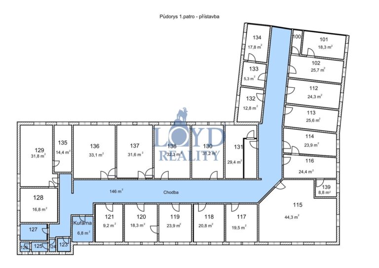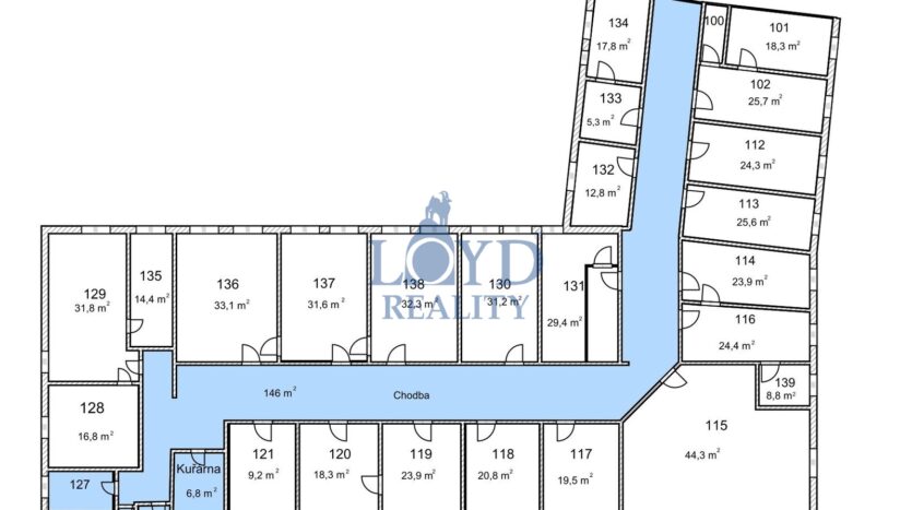 Celkem 22 kanceláří o ploše od 5,3 m2 do 44,3 m2 – viz plánek v galerii.