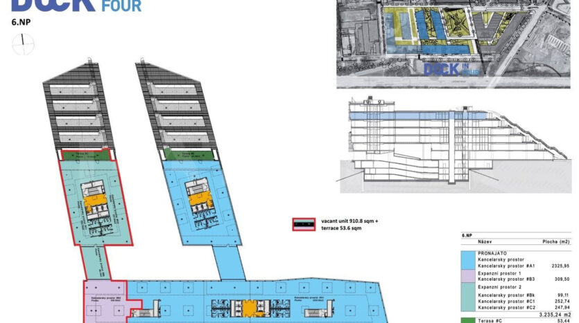 Dovolujeme si Vám nabídnout k pronájmu reprezentativní kancelářské prostory nacházející se v pátém patře v objektu DOCK IN FOUR o celkové výměře 708 m² + terasa 53 m², včetně addonu, které se nachází ve 4. NP moderní budovy v širším centru Prahy u Vltavy.