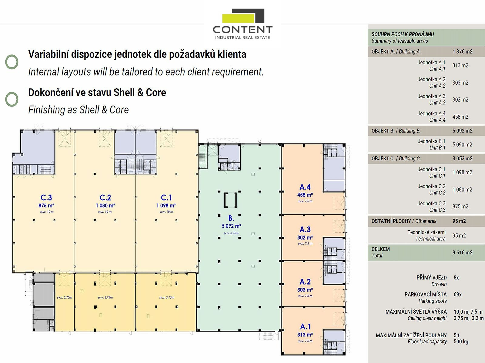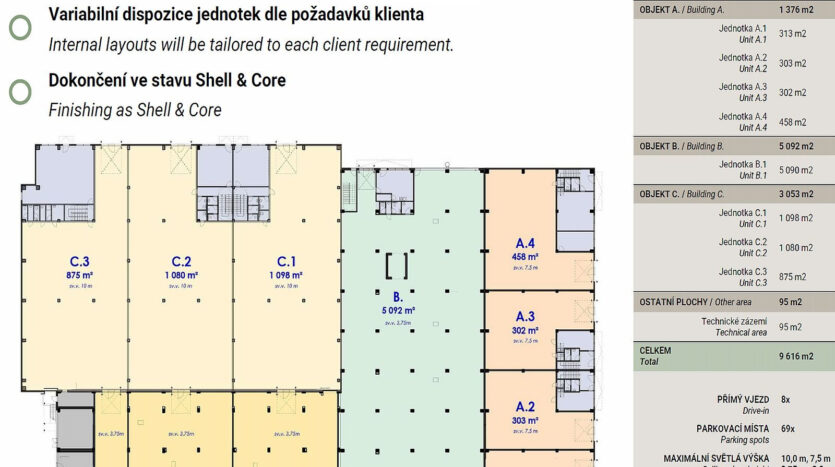 – celková pronajímatelná plocha v jednom celku až 1376 m² (celá budova A)