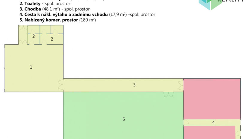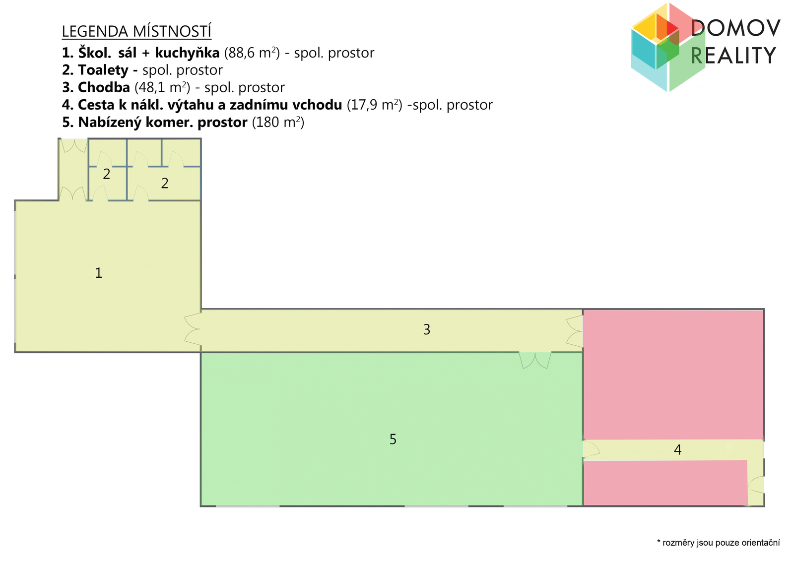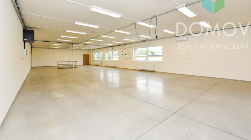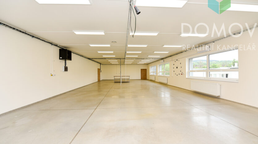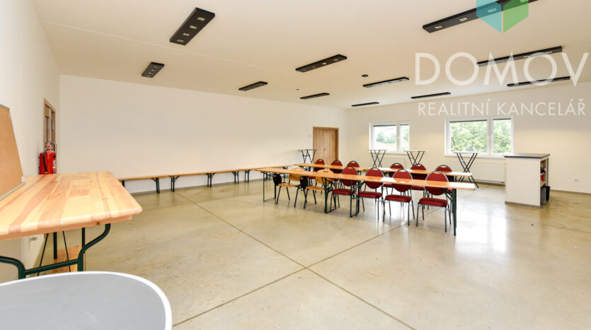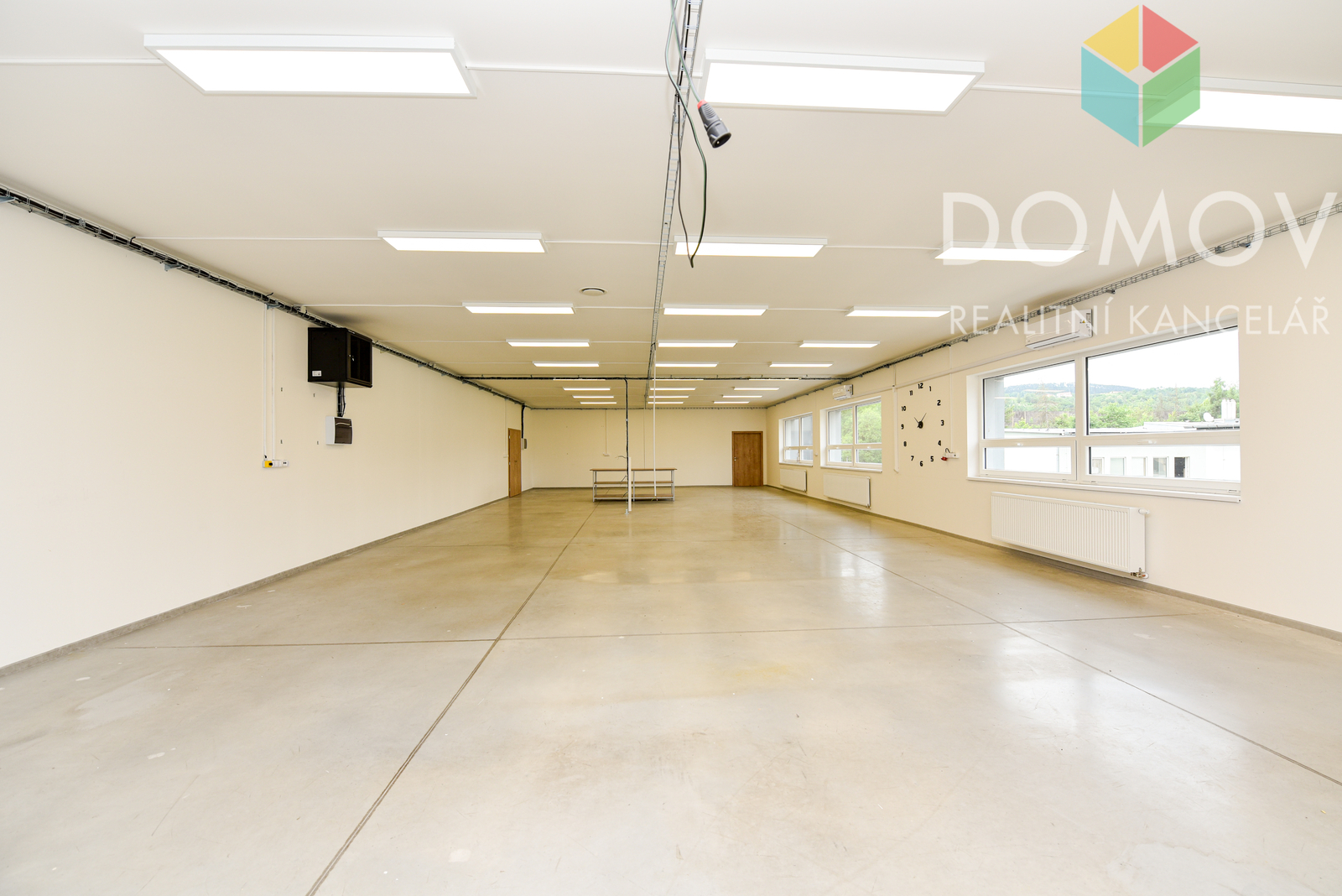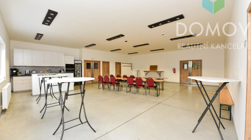 Kromě haly nájemce může používat dvoje společné toalety a velkou místnost (88,6 m2) s vybaveným kuchyňským koutem. Po domluvě lze tento prostor využívat jako školící místnost, jsou tam k dispozici židle, stoly i tabule.