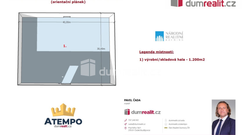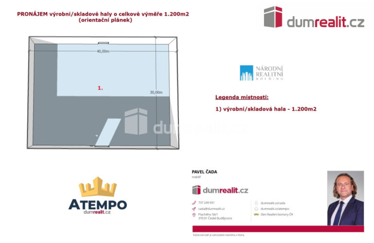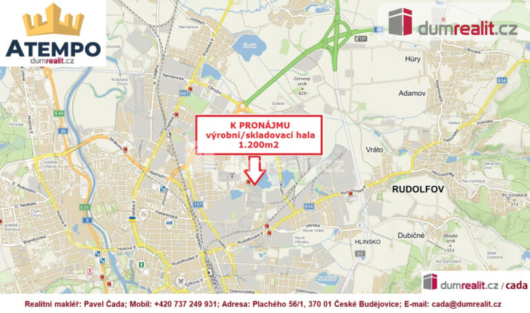Dumrealit.cz Vám zprostředkuje pronájem výrobních/skladovacích prostor o celkové výměře 1.200m2 s bezbariérovým přístupem, možností vykládek a nakládek kamionových souprav v ulici u U Sirkárny, České Budějovice. Prostory se nachází na strategickém místě ve vzdálenosti 3km od sjezdu z dálnice D3. Jedná se o netemperovaný, výrobní nebo skladovací prostor. Součástí pronájmu je veškeré vybavení regálovými systémy a případné další úpravy pronajímaného prostoru jsou možné po dohodě s majitelem areálu. Dále máme již v ceně pronájmu i 4 parkovací místa pro osobní automobily. Energie jsou fakturovány dle skutečné spotřeby. NELZE skladovat hořlaviny a chemické látky. V místě pronájmu lze zřídit sídlo firmy. Ideální místo připravené pro centralizované rozšíření působení a budování svého jména. Více informací Vám poskytne realitní makléř Pavel Čada. Ev. číslo: 643352. Bližší informace Vám sdělí Pavel Čada, 737 249 931, atempo@dumrealit.cz