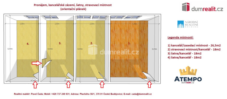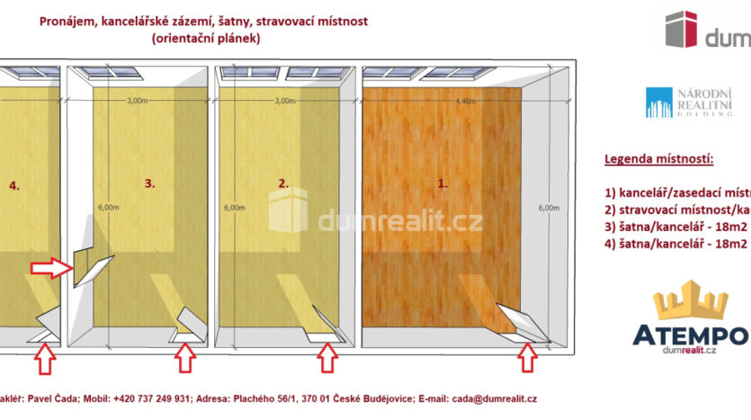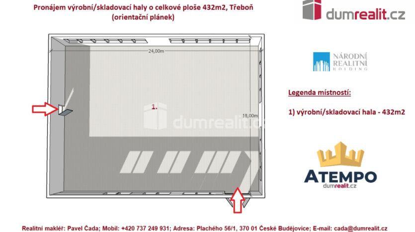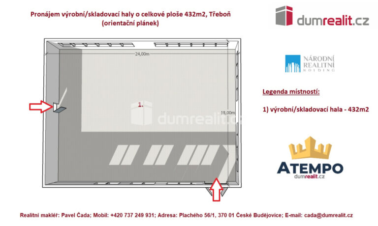 Dumrealit.cz Vám zprostředkuje pronájem výrobních/skladovacích prostor s bezbariérovým přístupem, možností vykládek a nakládek kamionových souprav v areálu Otavan, Třeboň. Jedná se o temperovanou halu o celkové výměře 432m2, kterou lze využít jako výrobní nebo skladovací prostory. Zároveň je možné si pronajmout venkovní oplocený prostor před logistickou halou o celkové výměře 400m2. Dále k tomu nabízíme i možnost pronájmu kancelářského zázemí, šaten a stravovací místnosti o celkové výměře 80,5m2. Veškeré prostory si lze pronajmout i samostatně pouze jako logistickou halu nebo kancelářské zázemí nebo jenom venkovní oplocený prostor. Nebytové komerční prostory se nachází v místě tranzitní křižovatky na Praha, Halámky/České Velenice – Rakousko, Jindřichův Hradec, České Budějovice. Energie jsou fakturovány dle spotřeby (7,- Kč bez DPH za kWh). Paušální poplatek 120,- Kč bez DPH/m2/rok za celoroční připravenost areálu. NELZE skladovat hořlaviny a chemické látky. V místě pronájmu lze zřídit sídlo firmy. Areál se nachází 100m od železniční zastávky, 150m od stravovacího zařízení/jídelny. Více informací Vám poskytne realitní makléř Pavel Čada z realitní kanceláře A TEMPO s.r.o. fungující pod ochrannou známkou dumrealit.cz. Zajistíme Vám financování a veškerý právní servis. Těším se na prohlídce. Ev. číslo: 642576. Bližší informace Vám sdělí Pavel Čada, 737 249 931, atempo@dumrealit.cz
